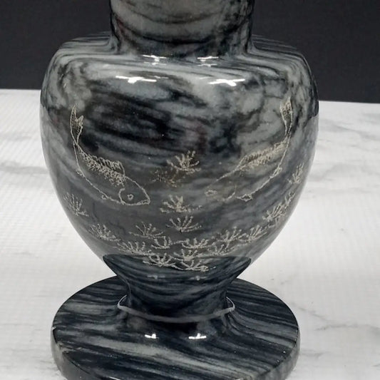 Asian Vase Stone Handmade Koi Fish Engraved Vintage