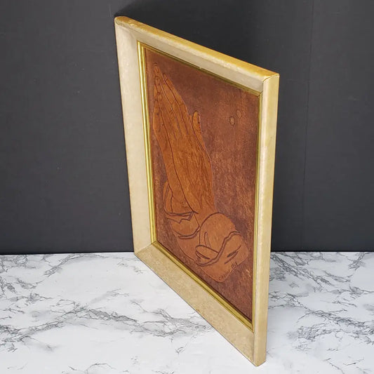 Handmade Leather Praying Hands Framed Vintage