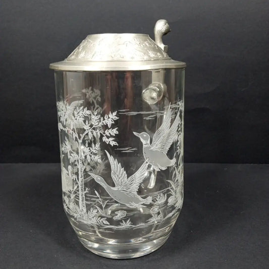 Beer Stein Etched Glass & Pewter Ducks ( Vintage )