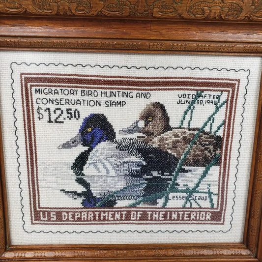 Framed Needlepoint Ducks Postage Stamp Vintage