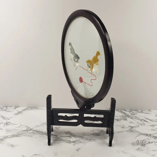 Asian Embroidered Cats Playing Wood Glass Vintage