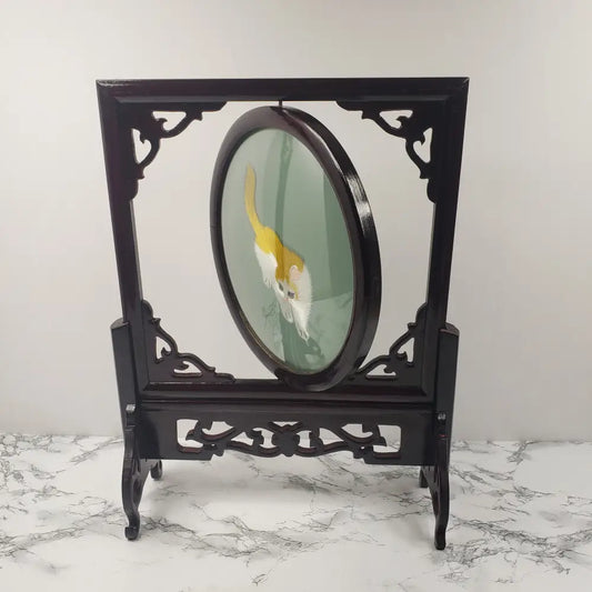 Oriental Embroidered Silk Cats Glass Wood Vintage