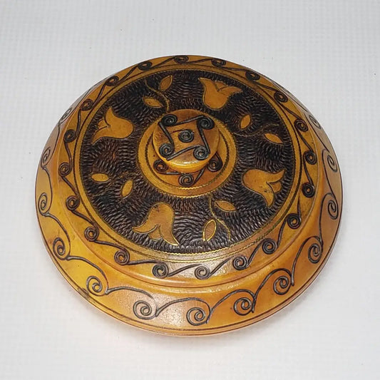 Hand Carved Copper Inlayed Round Lidded Wood Bowl Vintage